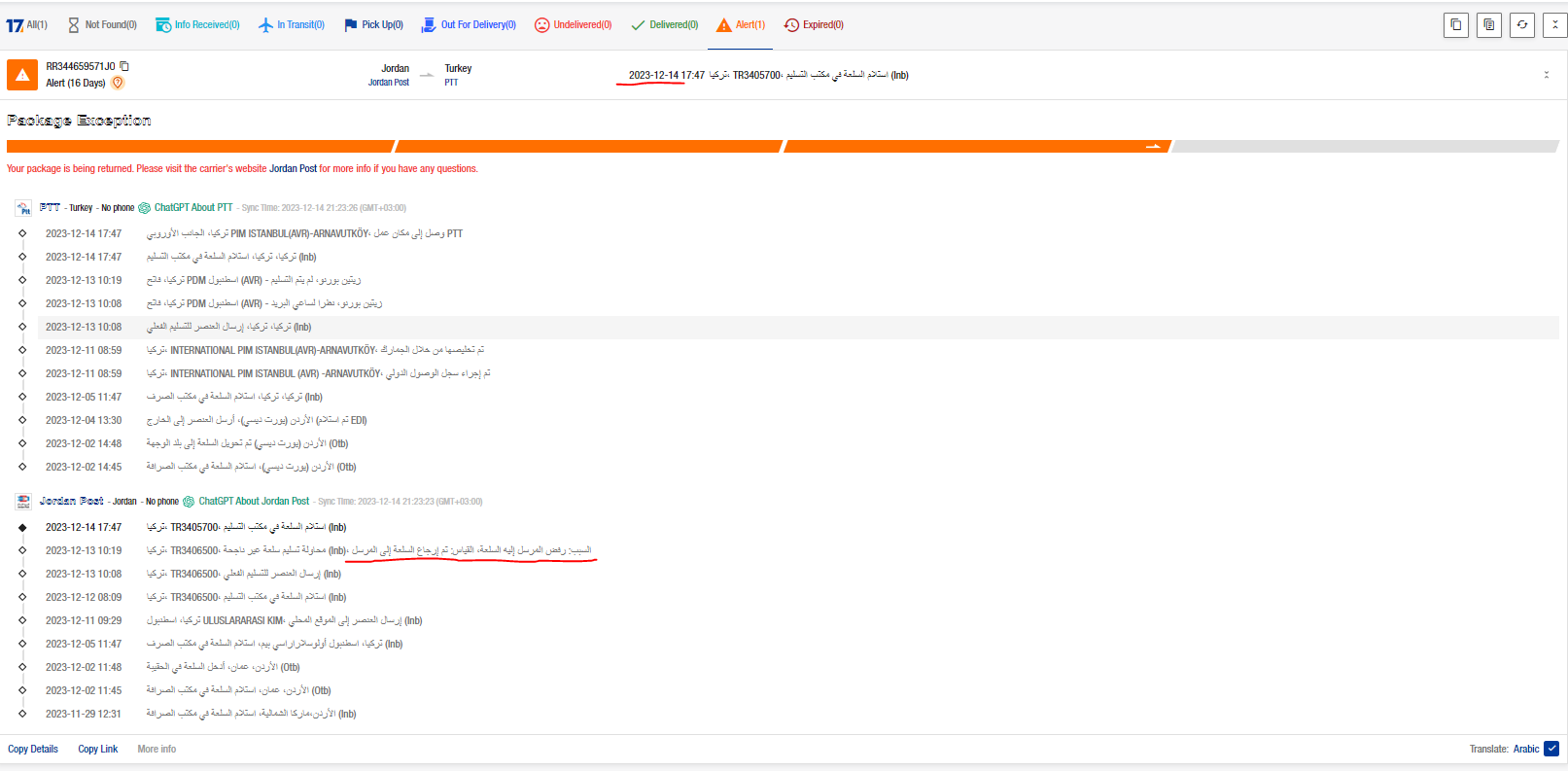 السلام عليكم ممكن شرح بس للصورة هاي تتبع لمنتج تم شحنه من الاردن لتركيا ما وصلني اي ملاحظة من المشتري ولكن عندما قمت بتتبع الطرد هذا تبين لي ان الطرد وصل اليوم ومكتوب رفض الاستلام شو يعني هيك ارسل للمشتري ولا انتظر ممكن يتم التسليم طبيعي