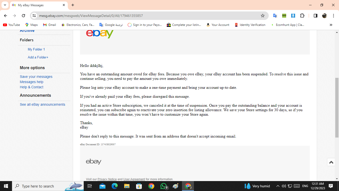السلام عليكم لقد تم ارسال رساله لي من ايباي ماذا تقصد وماذا علي ان افعل ؟؟؟يعني وين اكبس كيف احل المشكله ؟؟مش يطلعلي هس حدا يعطيني الترجمه بس ويروح زي المرة الي فاتت بدي حل قبل ما يتسكر لحساب شو العدادات الي اعملها عشان ادفع الي علي