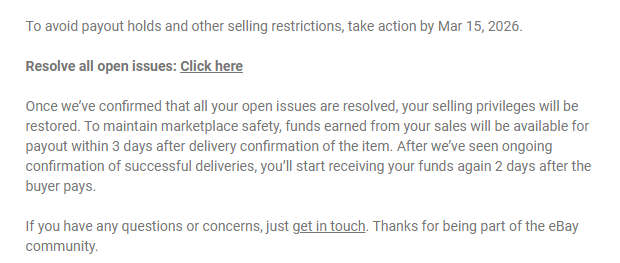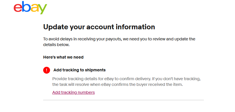 حسابي جديد في ايباي شحنت اول منتج و ادخلت رقم التتبع عادي لكن وصلني ايميل تقييد للحساب و أنه يجب أن ادخل رقم التتبع قبل 15 مارس رغم ان رقم التتبع موجود اصلا في الاوردر . ما الحل من فضلكم؟